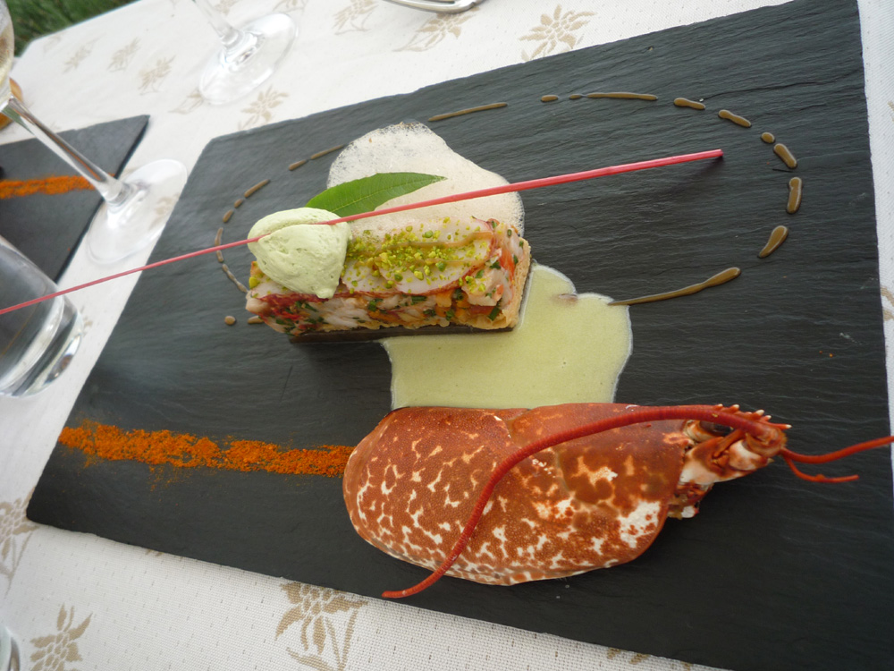 Homard breton tiède verveine pistache et gelée de carcasse, juste dosage de verveine, une merveille.